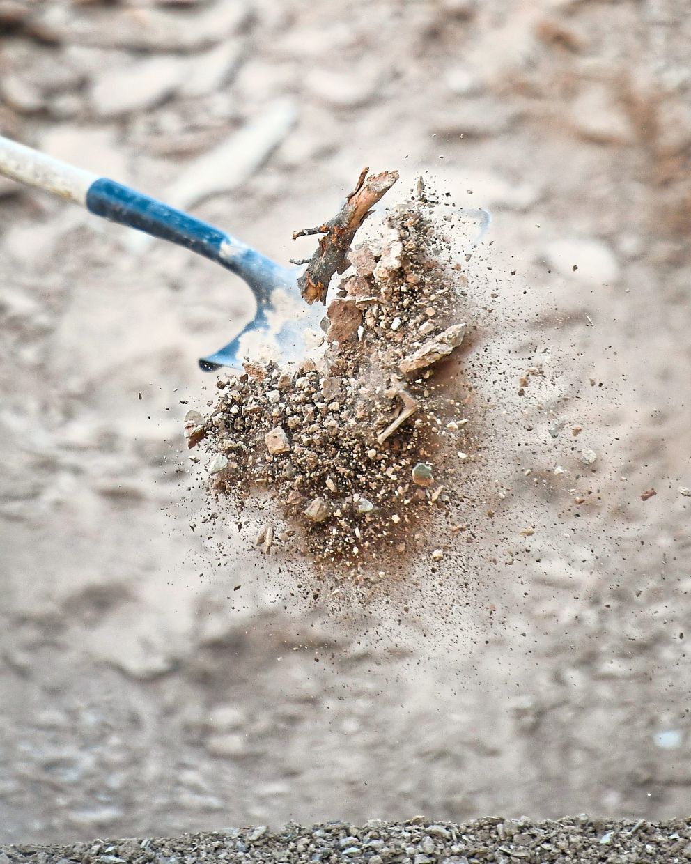 A crew member digs on the women’s course during the final practice day at Red Bull Rampage.