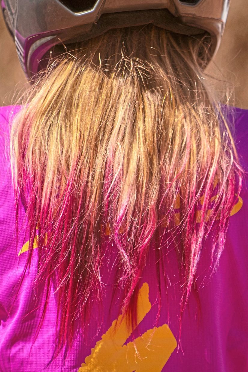 A detail view of Chelsea Kimball’s hair during the final practice day at Red Bull Rampage.
