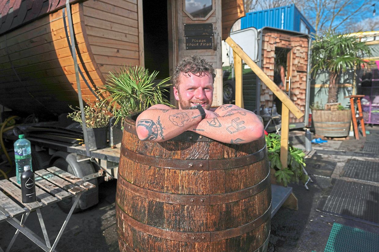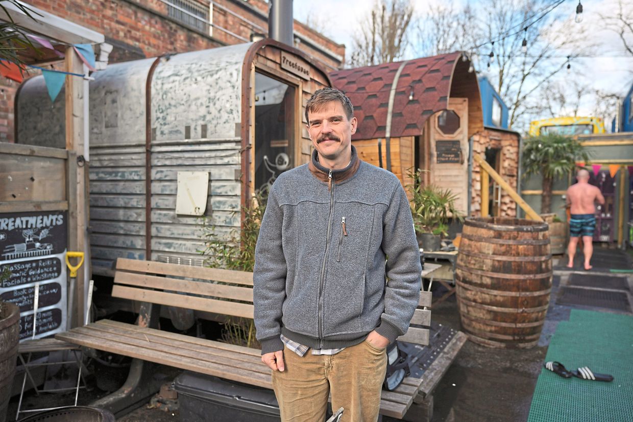 Charlie Duckworth, co-founder of the Hackney Wick Community Sauna Baths, posing in front of the sauna in London. — AP