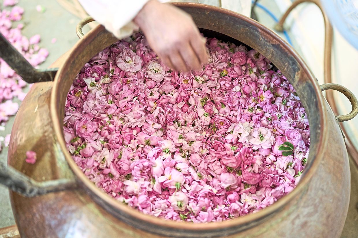 There, they are splayed onto tables, sorted and ultimately poured into copper cauldrons known as alembic stills, where they’re steamed and filtered into fragrant water and precious oil.
