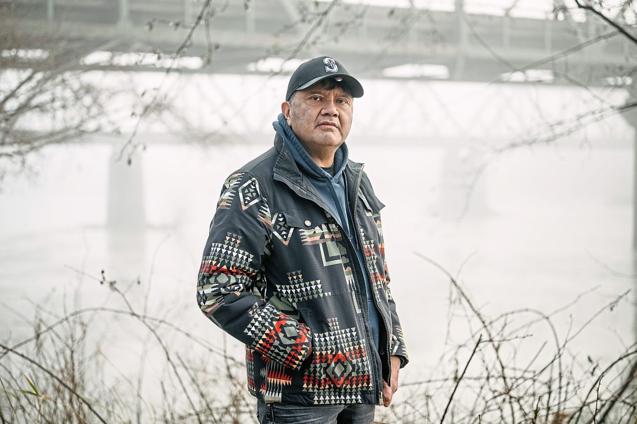 Schuyler (below), an elder and policy representative of the Upper Skagit Indian Tribe, walking near the Skagit River in Sedro-Woolley, Washington, in December 2025. Warming seas and increased flooding threaten a way of life for Native Americans who have called the Pacific Northwest coast their home for generations. — Grant Hindsley/The New York Times