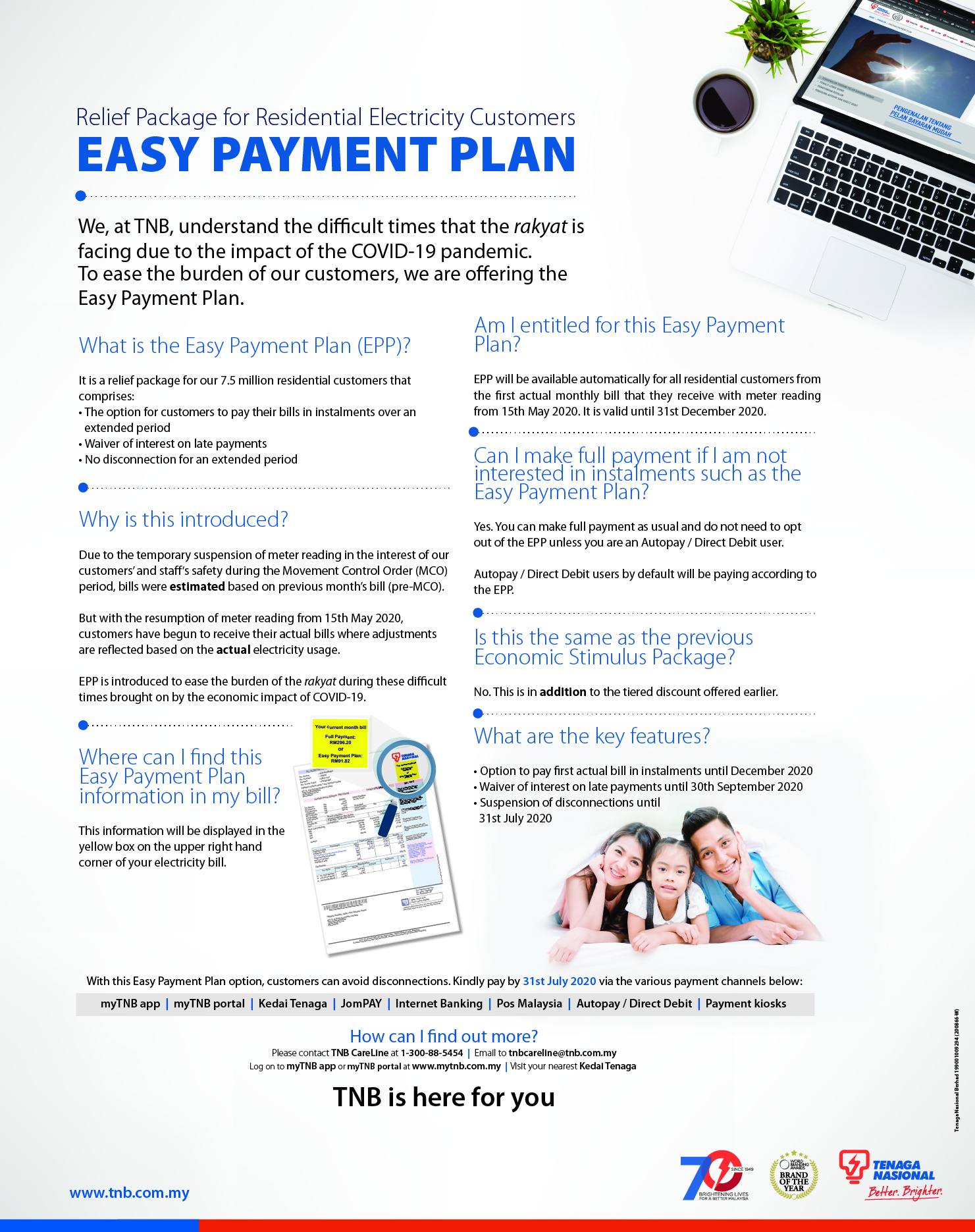 Using the EPP option, customers can avoid disconnections. Customers are encouraged to pay by July 31 via the myTNB app or myTNB portal, at the Kedai Tenaga, through Jompay or using Internet banking.
