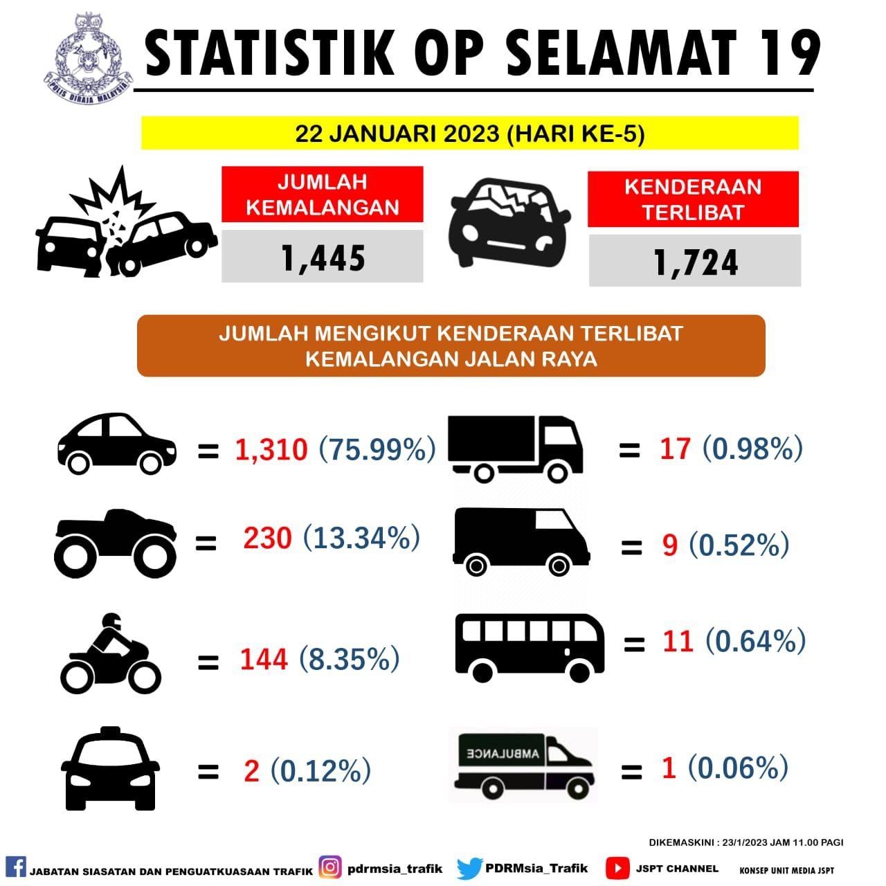 PETALING JAYA: More than 1,000 cars were involved in 1,445 accidents on Sunday (Jan 22), the fifth day of Ops Selamat 19, which began on Jan 18 in conjunction with Chinese New Year.