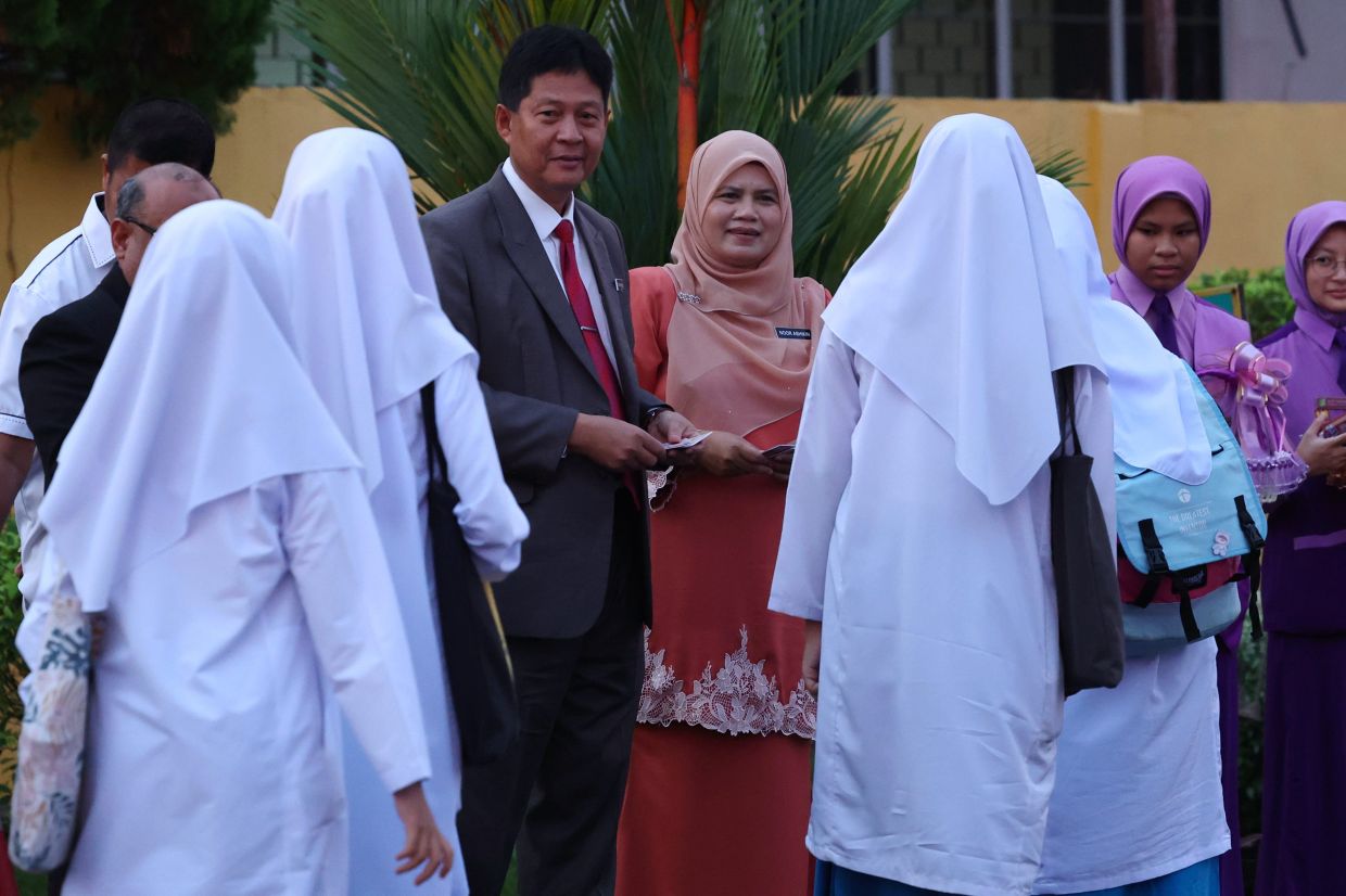 Teachers and "Pembimbing Rakan Sebaya” (peer mentors) also handed out apples and stationery to the students upon arrival as a motivational gift.