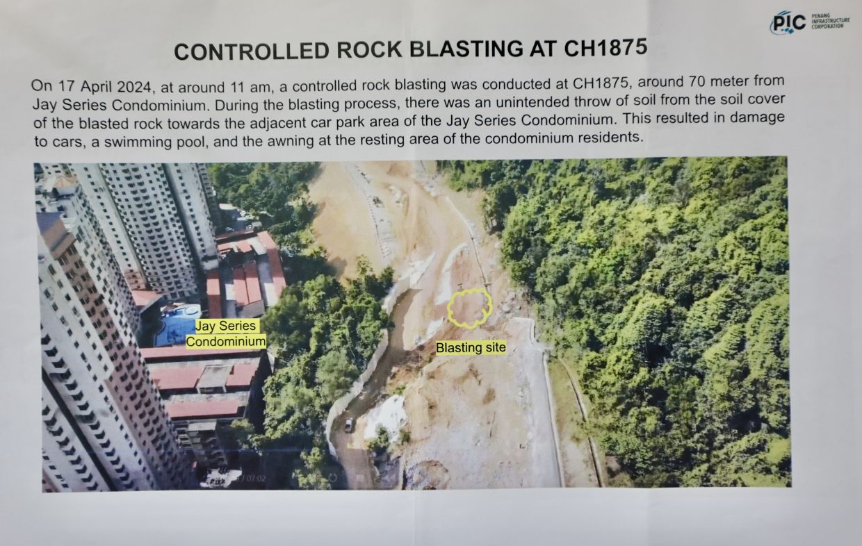 Flying debris and soil from the blasting works caused damage to rooftops in the condominium, including a swimming pool and barbecue areas as well as several parked vehicles.