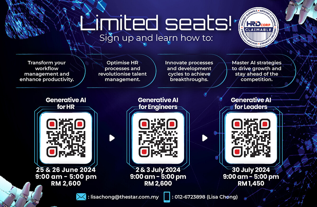 Generative AI for HR and Generative AI for Engineers cost RM2,600 each, while Generative AI for Leaders costs RM1,450. This workshop is also HRD Corp claimable!