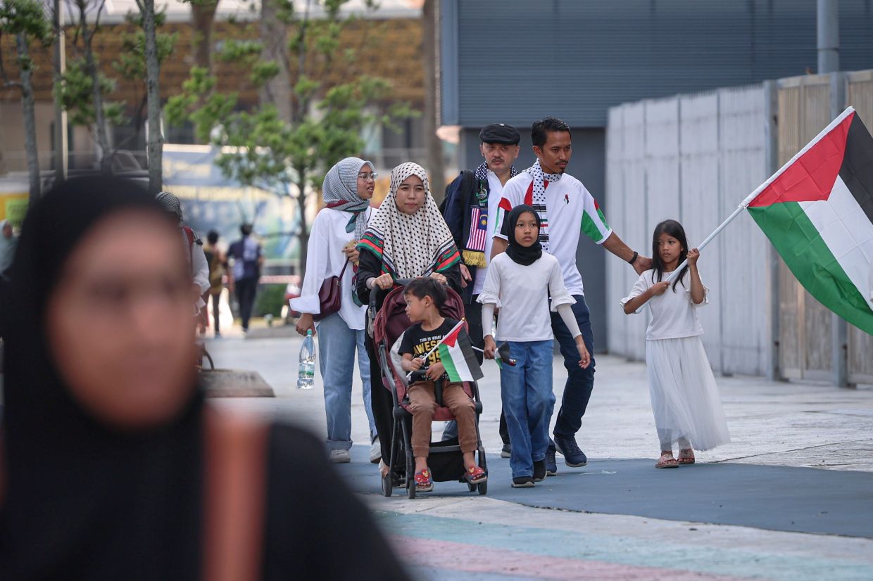 The crowd started gathering outside Axiata Arena in conjunction with Himpunan Pembebasan Palestin di Axiata Arena Bukit Jalil, Kuala Lumpur. — FAIHAN GHANI/The Star
