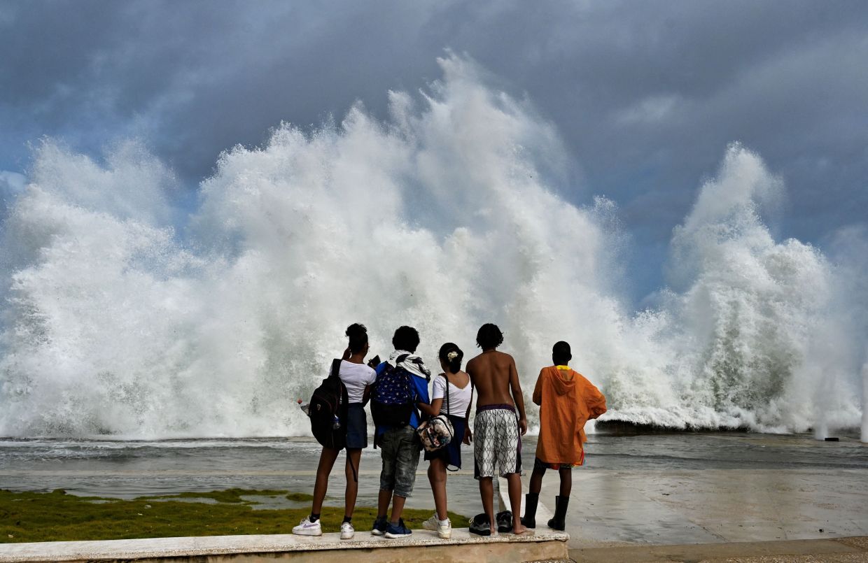 An old American car drives past waves crashing against the Malecon promenade in Havana due to the passage of Hurricane Milton on October 9, 2024. A "catastrophic" Hurricane Milton was closing in on the storm-battered state of Florida on Wednesday as US officials pleaded with residents to flee or risk dying. (Photo by YAMIL LAGE / AFP)