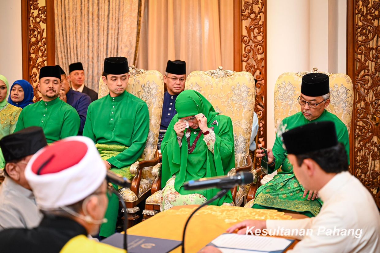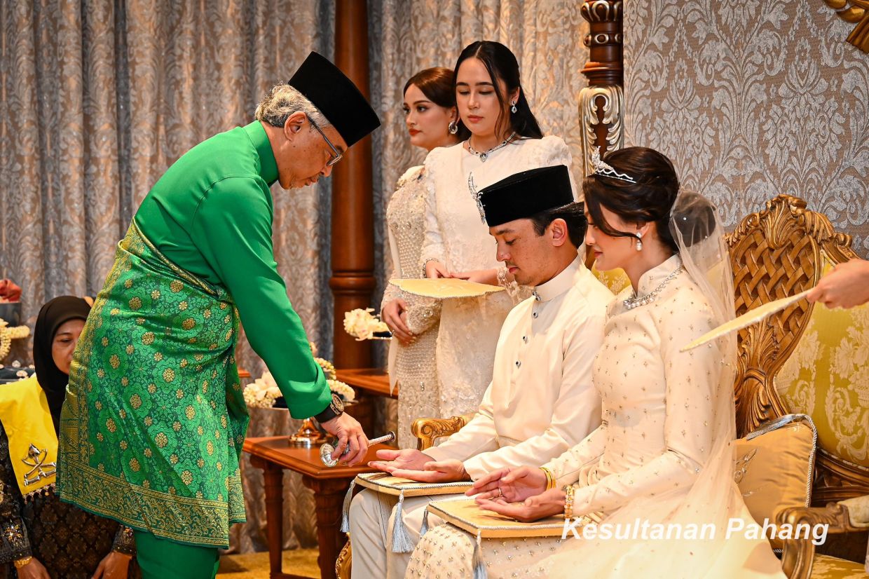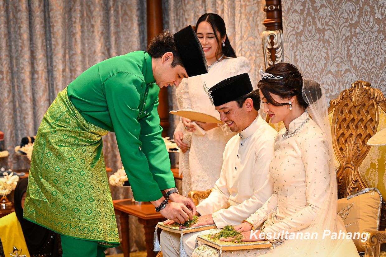 Sultan of Pahang, Al-Sultan Abdullah Ri'ayatuddin Al-Mustafa Billah Shah, and Tengku Ampuan Pahang Tunku Azizah Aminah Maimunah Iskandariah, who were dressed in green, witnessed the solemnisation ceremony alongside their children.
