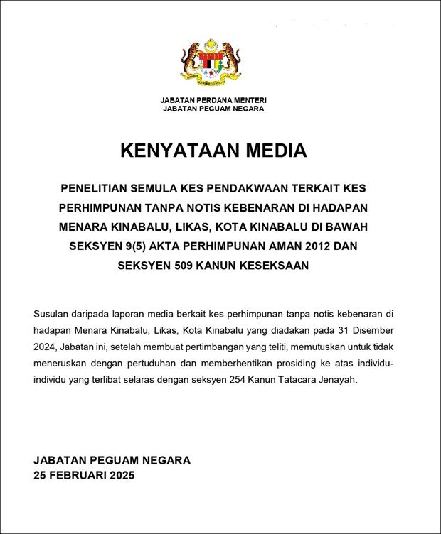 In a statement posted on its Facebook and X (formerly Twitter) on Sunday (Feb 25), the AGC announced that after careful consideration, it would not proceed with the charges and would discontinue legal proceedings in accordance with Section 254 of the Criminal Procedure Code.