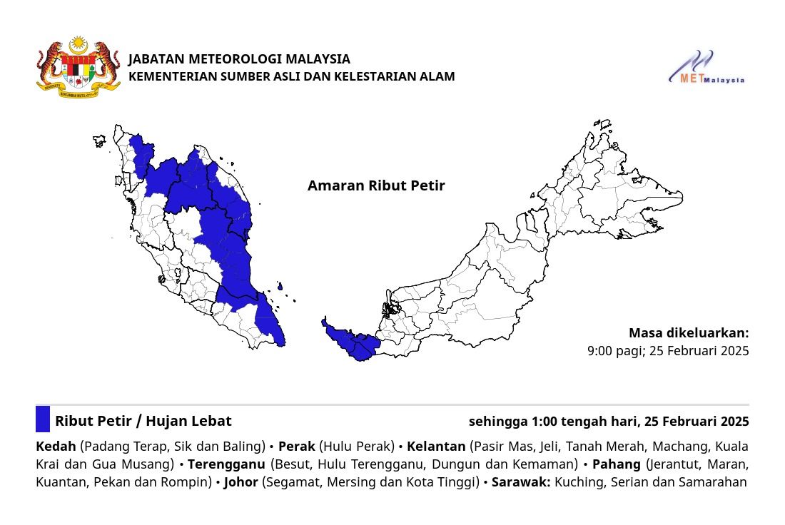 In a statement, MetMalaysia said the affected states are Kedah, Perak, Kelantan, Terengganu, Pahang, Johor and Sarawak.
