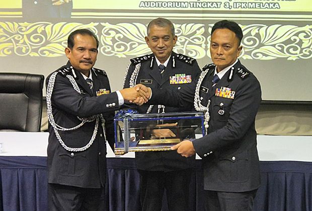 Acting Melaka police chief Senior Asst Comm Datuk Md Nazri Zawawi handed over his duties to incoming state chief Deputy Comm Datuk Dzulkhairi Mukhtar.