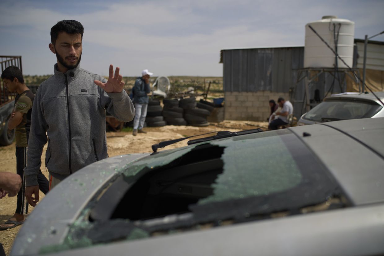 On Tuesday, a small bloodstain could be seen outside their home, and the car's windshield and windows were shattered. Neighbours pointed to a nearby water tank with a hole in the side that they said had been punched by the settlers.
