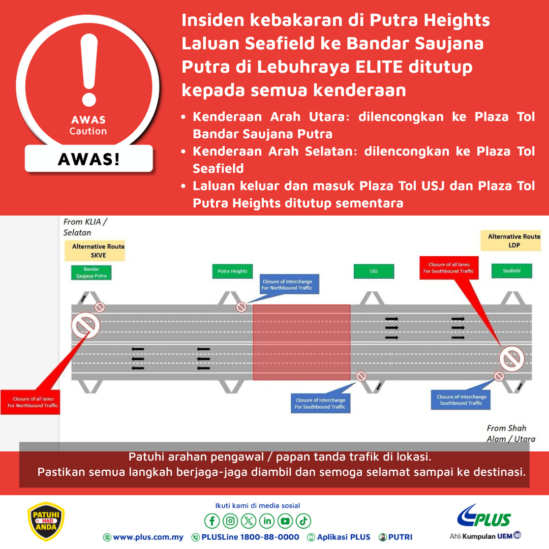 Plus Malaysia Berhad said users who are going South would be diverted to the Seafield Tol Plaza and be allowed to rejoin the Elite Highway through the Bandar Saujana Putra Toll Plaza.