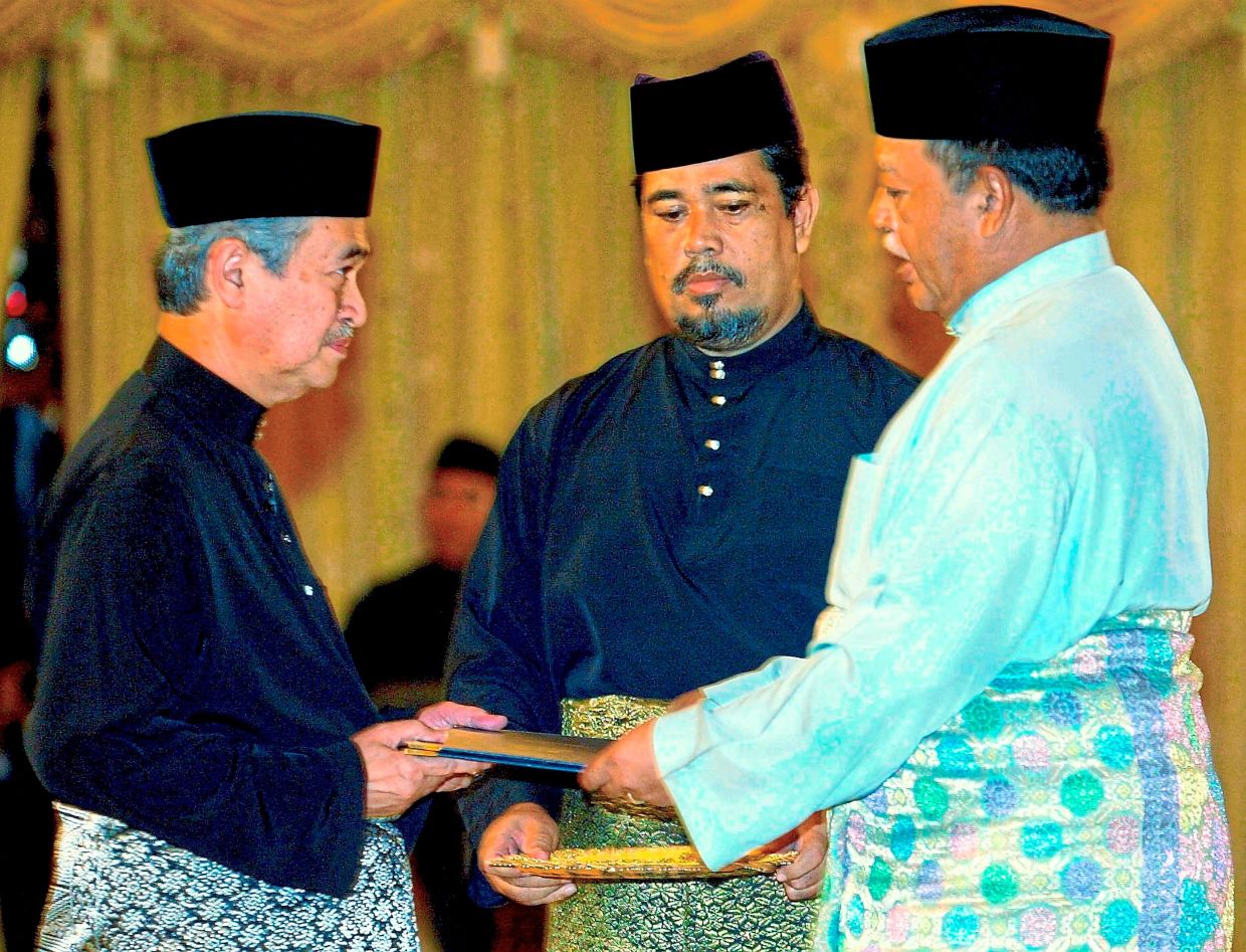 A great responsibility: Then Yang di-Pertuan Agong Tuanku Syed Sirajuddin Syed Putra Jamalullail presented the letter of appointment to Abdullah, officially swearing him in as the fifth Prime Minister, during a ceremony at the Throne Room of the National Palace on Oct 31, 2003.