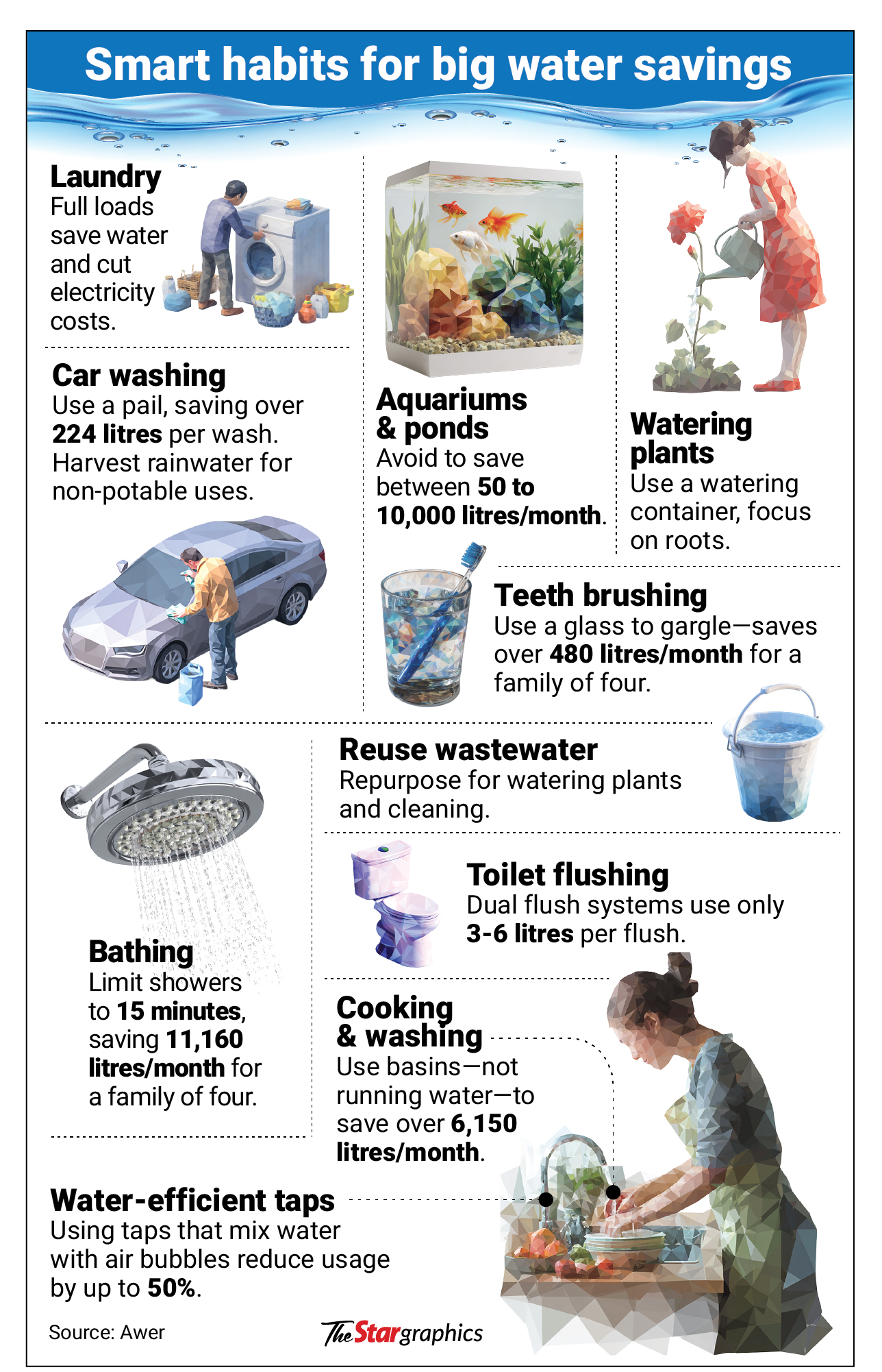 PETALING JAYA: Limiting showers to 15 minutes and gargling with a glass when brushing teeth are some effective ways to save water, say experts, as concerns mount that rising temperatures could lead to overconsumption of this resource.