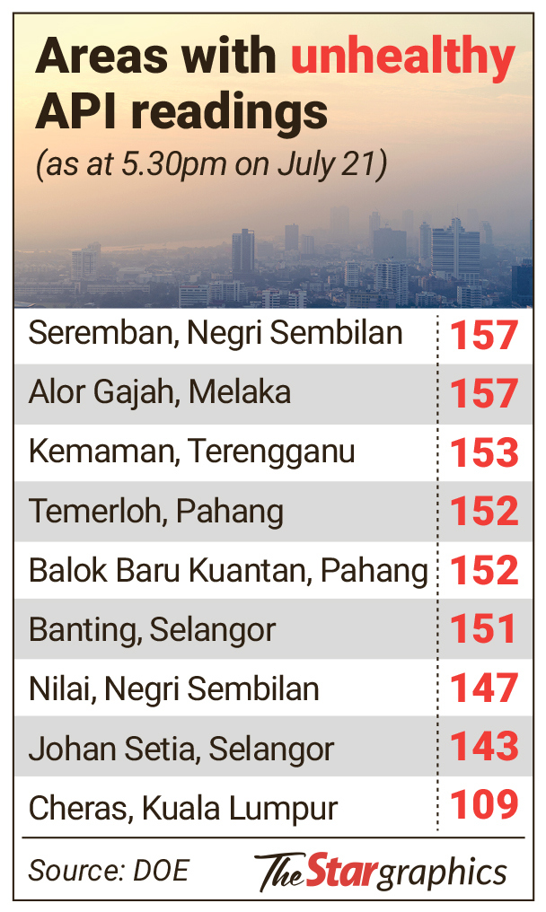 As of 5.30pm yesterday, DOE’s Air Pollutant Index Management System (APIMS) website recorded Seremban and Melaka’s Alor Gajah as having a reading of 157, the highest for the country.