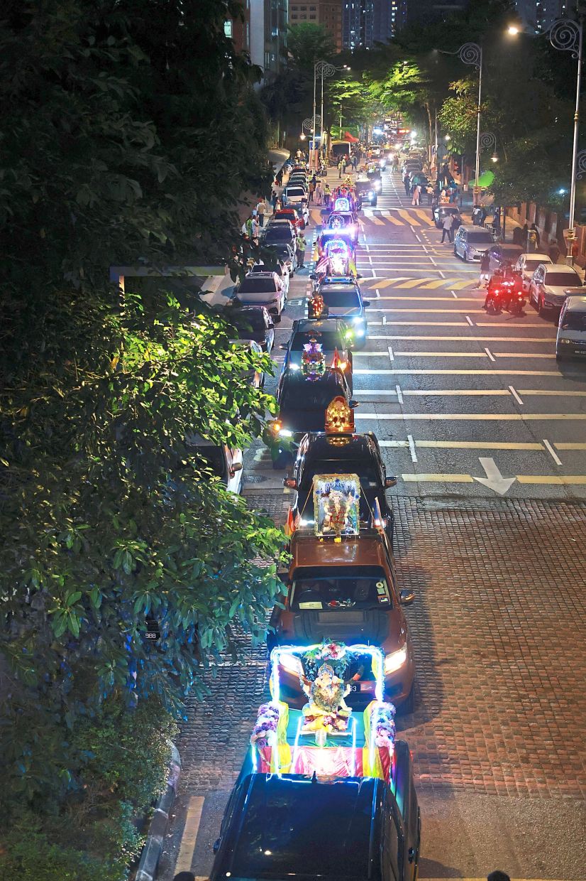 Making a sacred journey: Devotees taking part in the procession to honour Ganesha and (below) 4WD vehicles carrying vinayagar statues to the Sri Sakthi Karpaga Vinayagar Temple along Jalan Berhala in Brickfields, Kuala Lumpur. — KAMARUL ARIFFIN/The Star