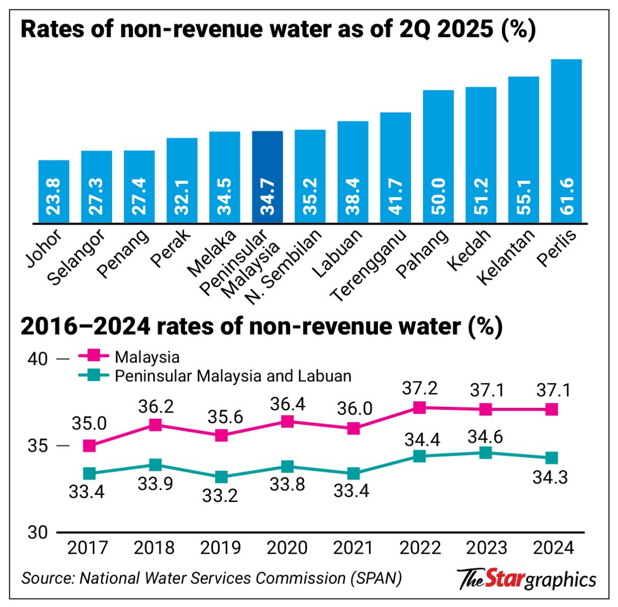 According to SPAN’s data, as of June this year, the NRW rates for Selangor, Johor and Penang are 27.3%, 23.8% and 27.4%, respectively.