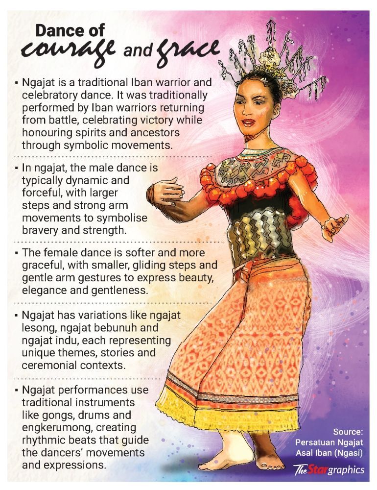 “Since I was a child, I have watched people perform ngajat at events. I have always been drawn to it because it’s very graceful. Every movement tells a story, and it’s a beautiful way to connect with the culture and values of the Iban community,” says Mas Noraina during a Zoom interview from Kuching recently.