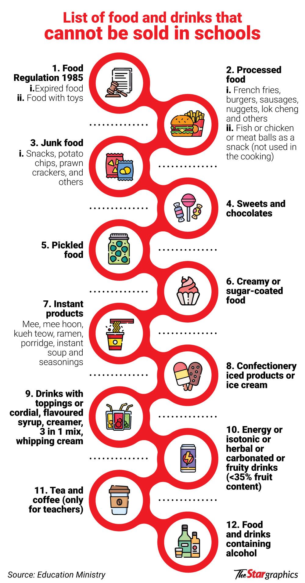 On Sept 23, the Education Ministry announced on its Facebook page the collaboration with the Health Ministry’s Nutrition Division, outlining 12 types of food and beverages that are prohibited from being sold in schools.