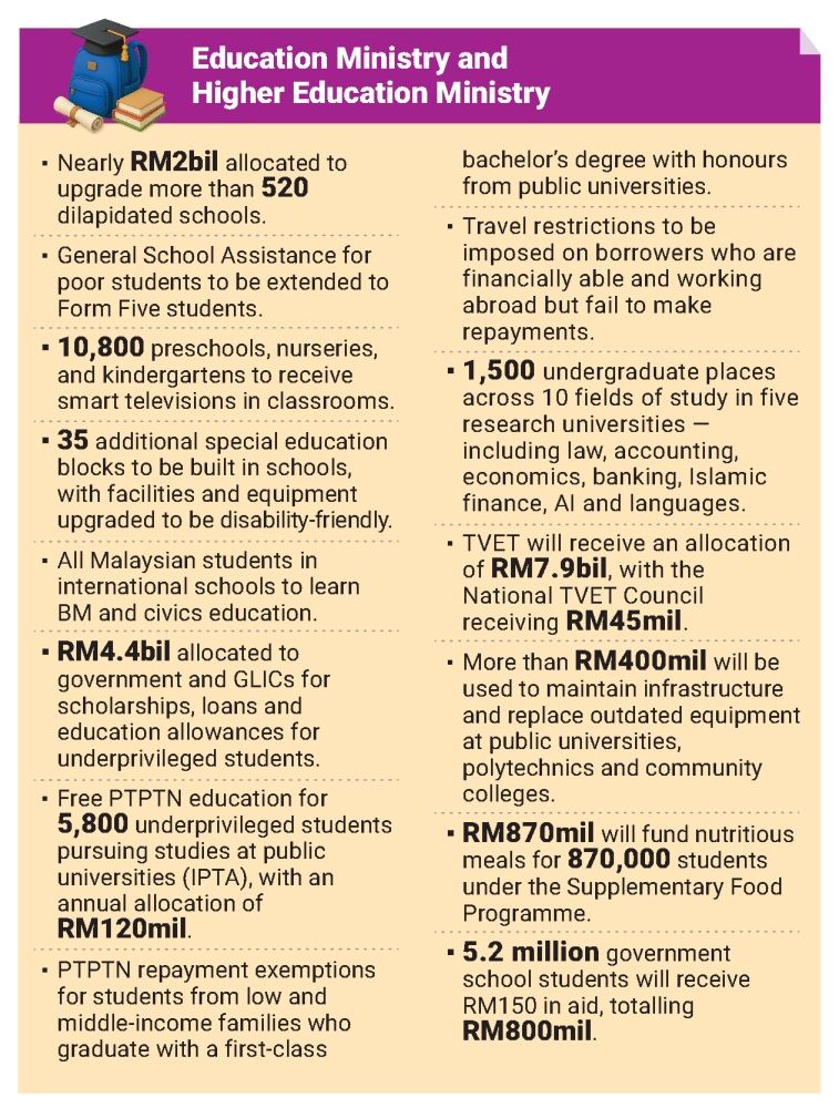 As for the Technical and Vocational Education and Training (TVET) sector, which received RM7.9bil, up from RM7.5bil, Universiti Tun Hussein Onn Malaysia Faculty of Technical and Vocational Education’s Prof Dr Razali Hassan said the increased allocation for TVET will enhance upskilling, reskilling, and talent development initiatives to meet future industry needs.