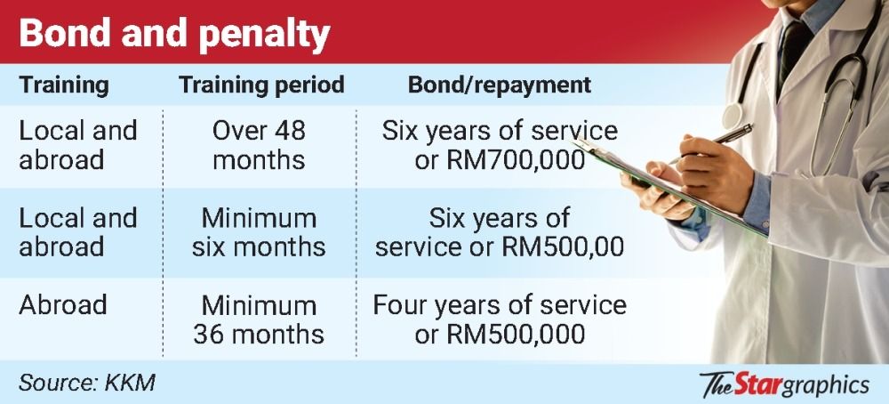 For those trained locally, the bond period is four years of service with a RM500,000 penalty.