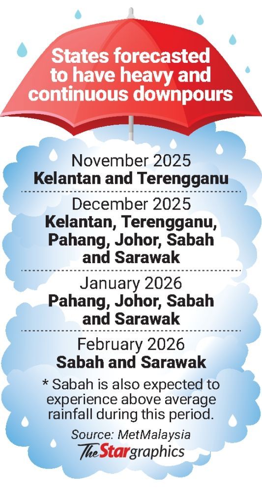 Ambun said Kelantan, Terengganu, Pahang, Johor and Sarawak are also forecast to experience heavy, continuous downpours between November and Dec-ember.