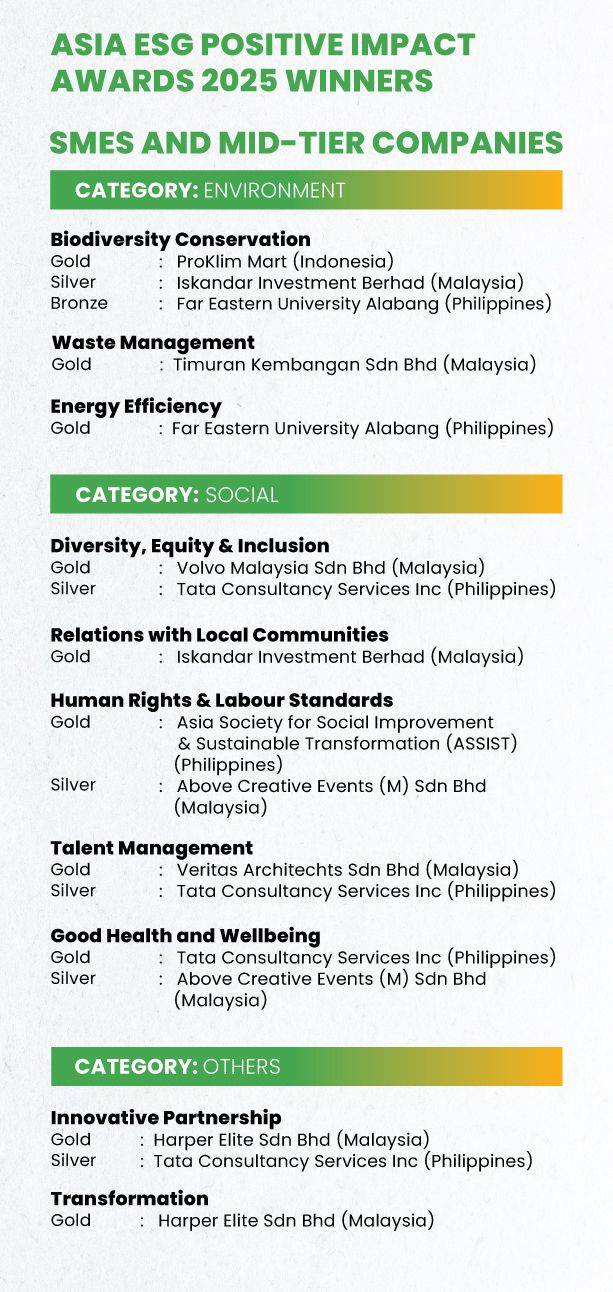 PETALING JAYA: The role of the public and private sectors in driving sustainability took centre stage at the Asia ESG Positive Impact Awards (PIA) 2025 as 39 winners from across Malaysia, the Philippines and Indonesia took home a total of 52 awards in recognition of their environmental, social and governance (ESG) efforts.
