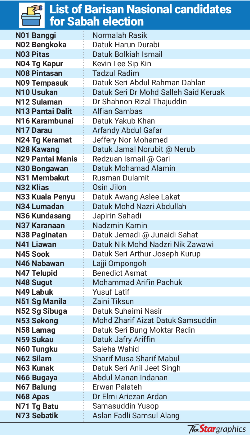 KOTA KINABALU: Barisan Nasional will contest 41 of the 73 seats, with its chairman Datuk Seri Bung Moktar Radin set to lead the coalition to “win back” the state government they lost in the 2018 general election.