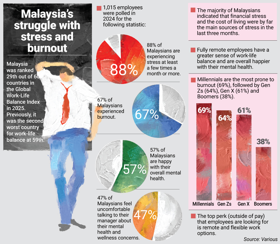 PETALING JAYA: Long hours and an “always-on” work culture are fuelling a burnout crisis among Malaysia’s young professionals – and a year after being ranked second worst globally for work-life balance, many continue to cry out over rising stress and exhaustion.