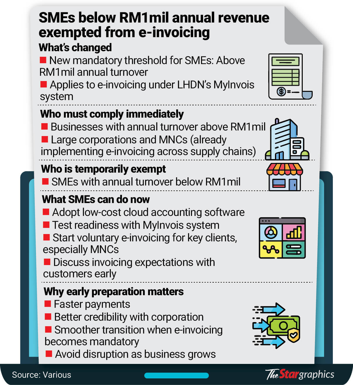 PETALING JAYA: While the government’s move to raise the mandatory e-invoicing threshold to an annual turnover of RM1mil offers temporary relief to small and medium enterprises (SMEs), industry players should take advantage of the pause to improve their readiness, say groups.