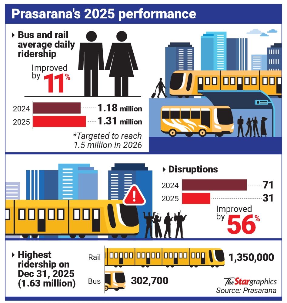Prasarana Malaysia Bhd reported yesterday a daily average of 1.31 million passengers across its networks last year, representing an 11% increase from the 1.18 million recorded in 2024.