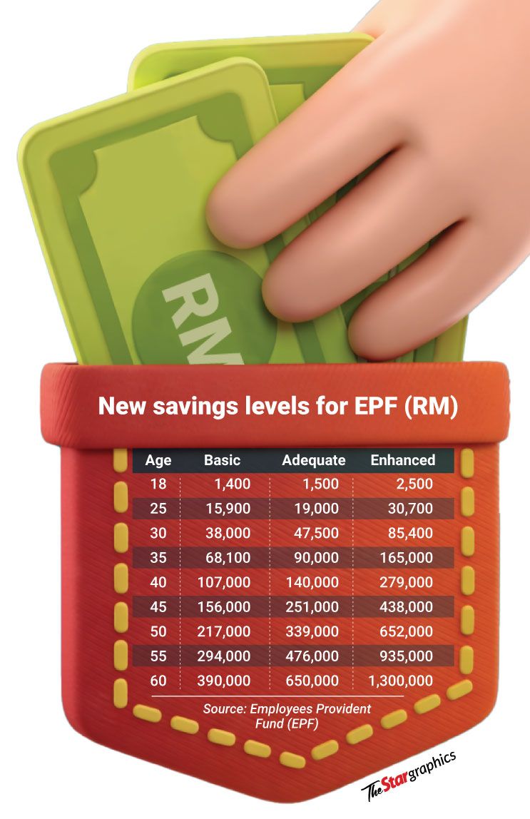 Starting this year, the EPF’s Retirement Income Adequacy (RIA) framework will introduce a three-tier savings framework – adequate savings (RM650,000), basic savings (RM390,000) and enhanced savings (RM1.3mil).