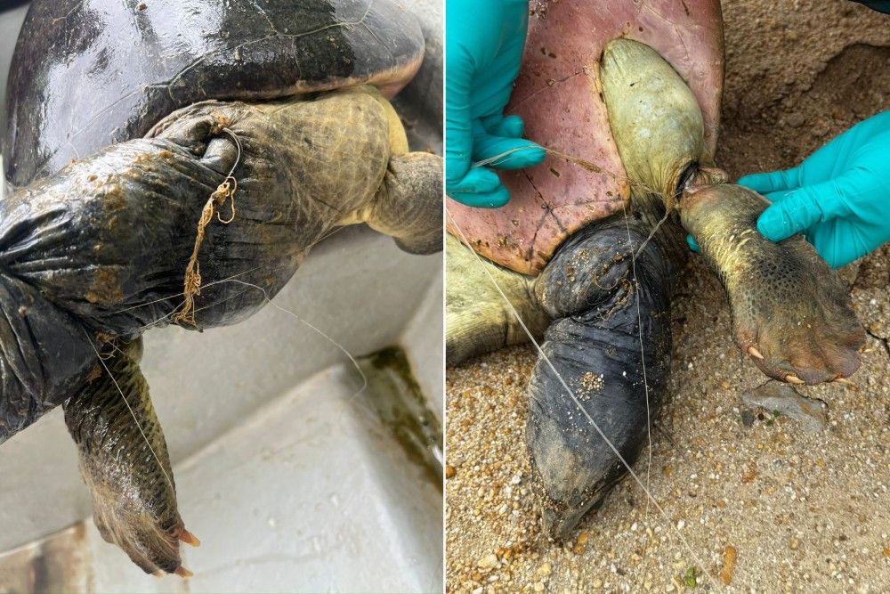 In a statement, TCS said the 18kg sub-adult male terrapin measuring 47cm in length, was snagged by a fish trap, with fishing lines entangling its feet and neck.