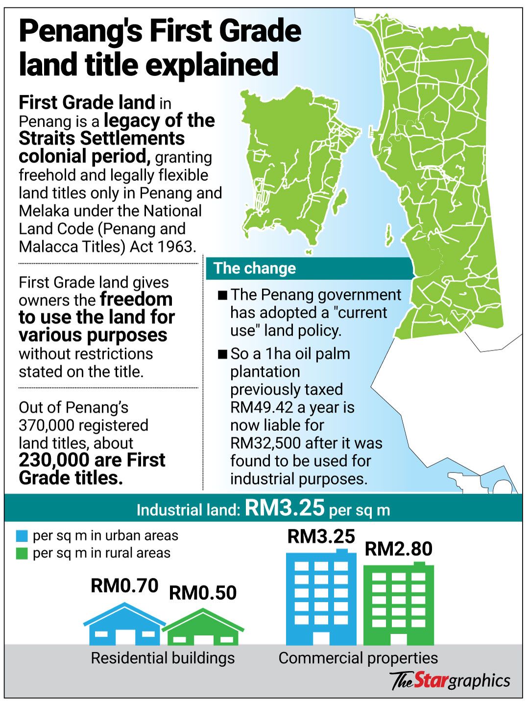 GEORGE TOWN: A 1ha First Grade land in Bandar Alma that was previously taxed RM49.42 a year under an oil palm plantation rate is now liable for RM32,500 because it was found to be used for industrial purposes.