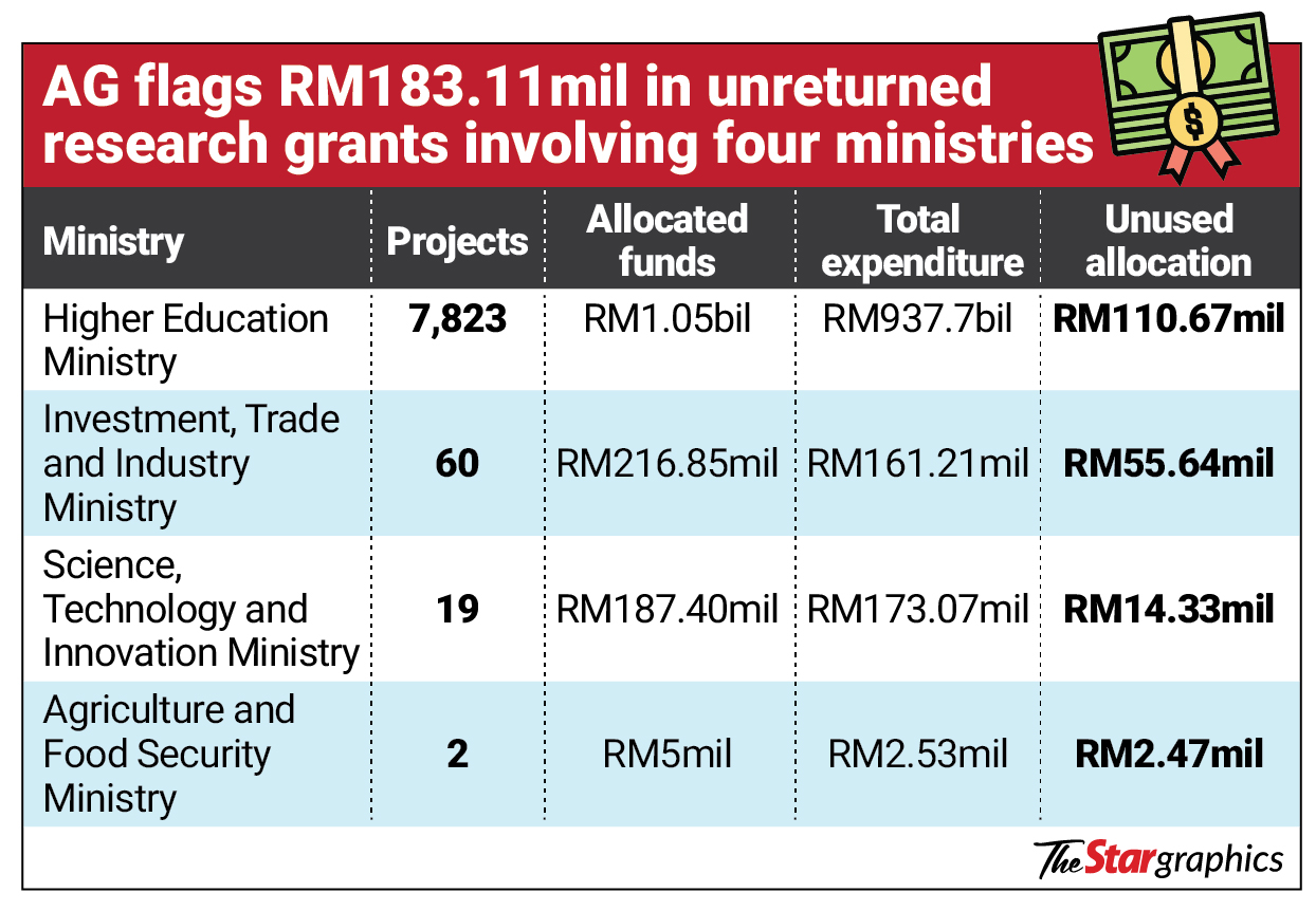 “The highest amount of unreturned balances is the Higher Education Ministry, involving five research universities amounting to RM110.67mil for 7,823 projects,” it said in a report published on its website yesterday.