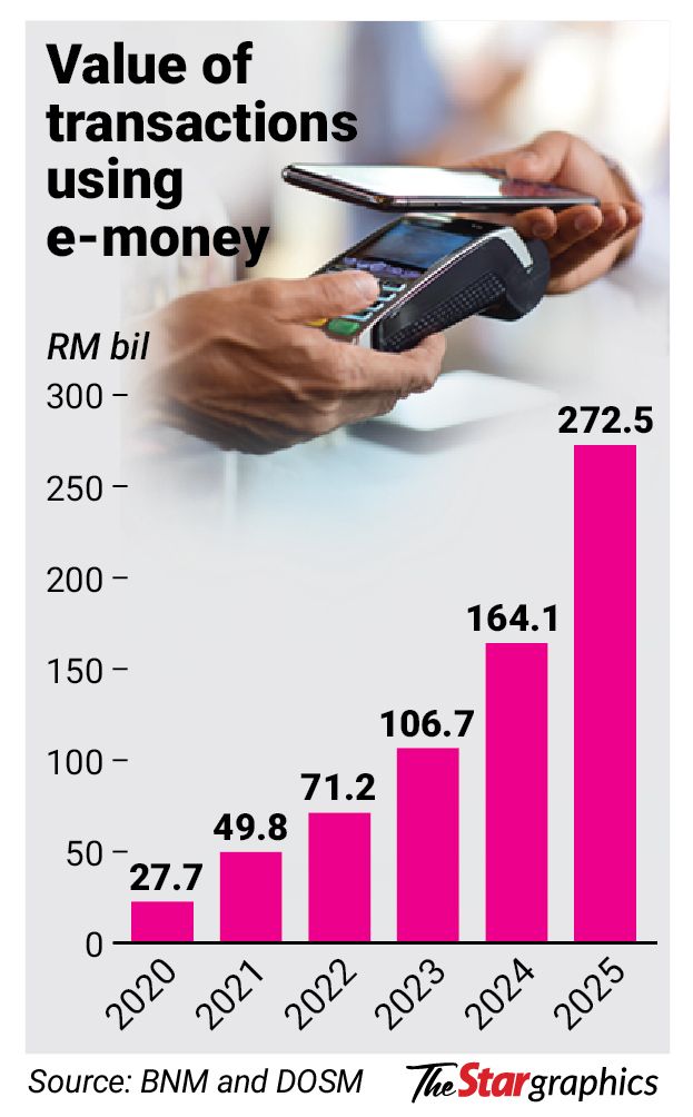 Between 2022 and 2025, the amount of e-money transacted had almost quadrupled in value from RM71.1bil to RM272.5bil.