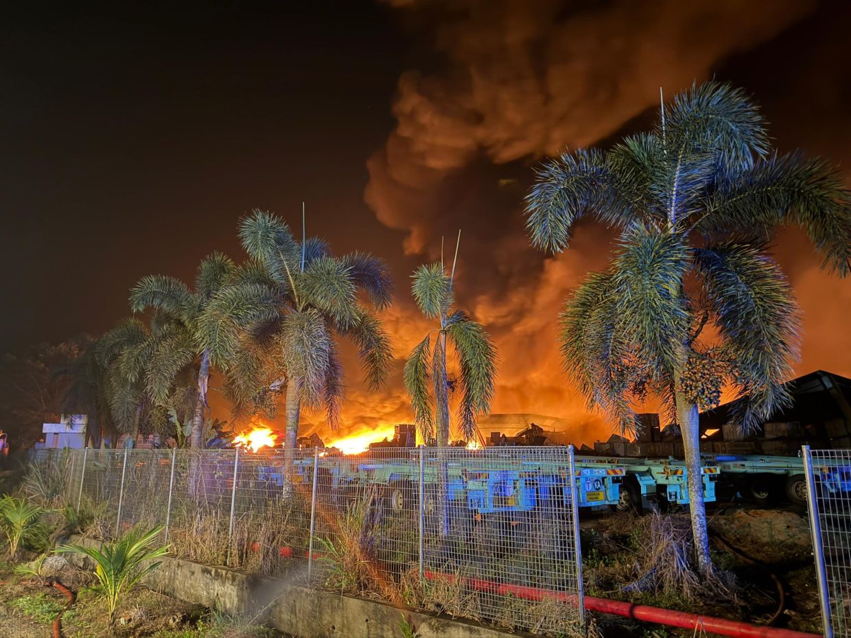 KULAI: A rubber and plastics storage warehouse went up in flames on Tuesday (Feb 24) afternoon, with firefighters still battling to put out the fire more than 19 hours later.
