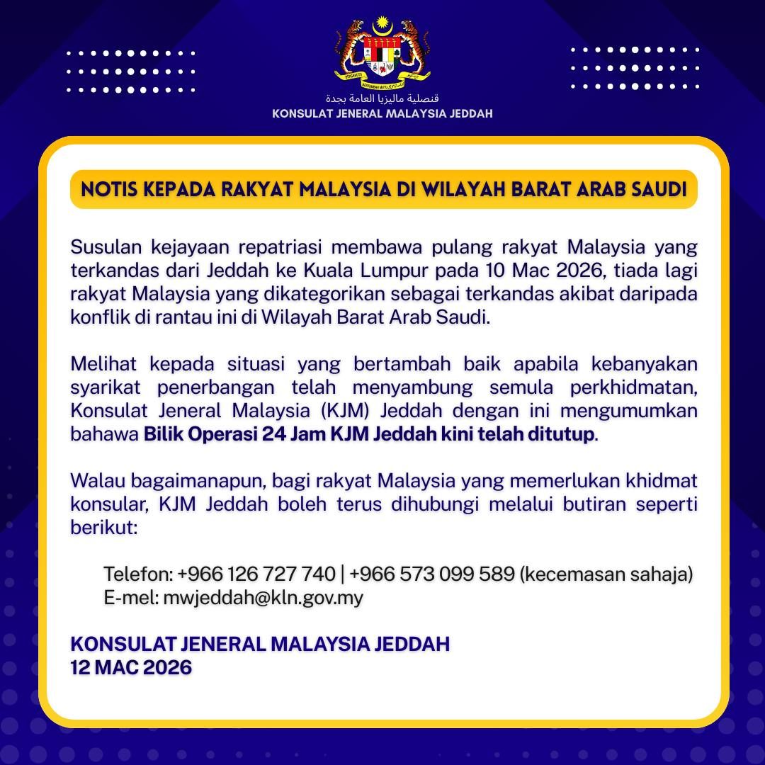 "Considering the improving situation, with most airlines having resumed their services, the Consulate-General of Malaysia in Jeddah hereby announces the closure of its 24-Hour Operations Room.