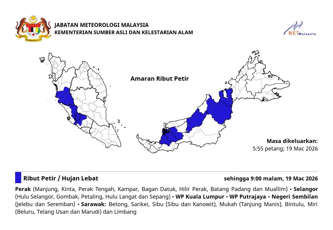 In a statement at 5.55pm on Thursday, MetMalaysia said the states affected are Perak (Manjung, Kinta, Perak Tengah, Kampar, Bagan Datuk, Hilir Perak, Batang Padang and Muallim); Selangor (Hulu Selangor, Gombak, Petaling, Hulu Langat and Sepang); Federal Territories of Kuala Lumpur and Putrajaya as well as Negri Sembilan (Jelebu and Seremban).