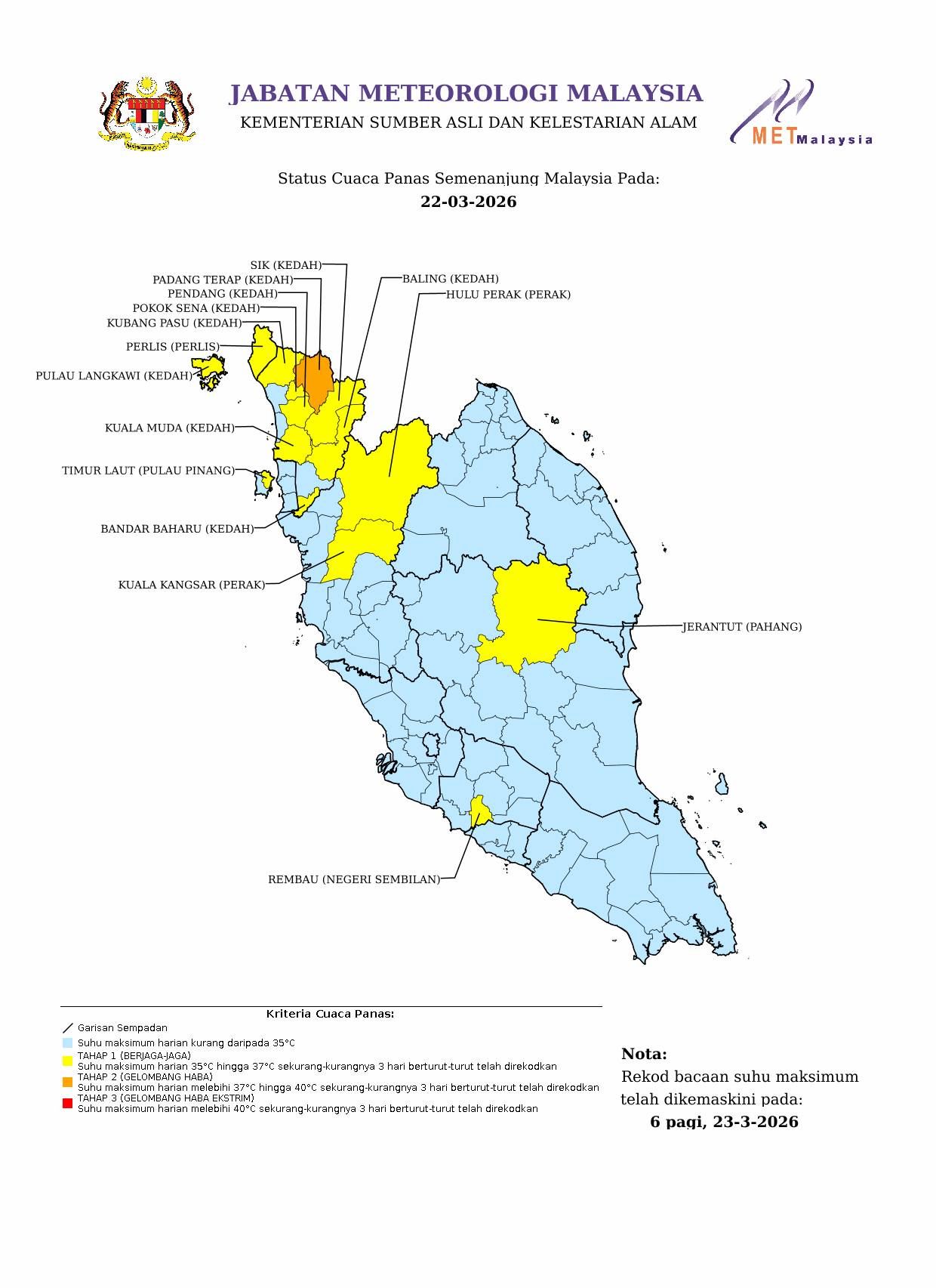 The alert, issued by the Malaysian Meteorological Department (MetMalaysia) on Monday (March 23), came after maximum daily temperatures of between 35°C and 37°C were recorded for at least three consecutive days in the district and other areas designated under Level One.