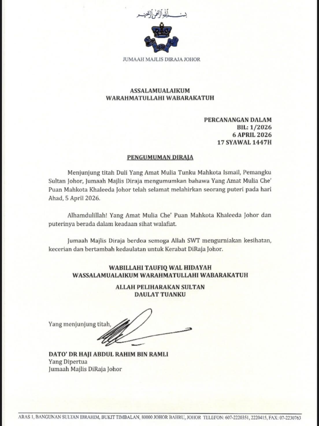 Johor Council of Royal Court president Datuk Dr Abdul Rahim Ramli announced that Johor Regent Tunku Ismail Sultan Ibrahim and his wife Che’ Puan Mahkota Khaleeda Johor’s princess was born on Sunday (April 5).