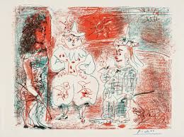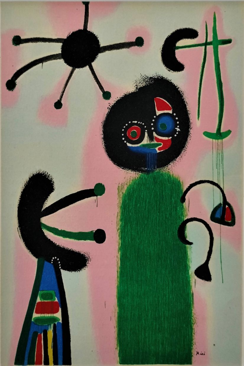 The four artworks are: Joan Miró's Composition (1953), Maurice Utrillo's Maison de rendez-vous de chasse de Henri IV, Rue St. Vincent, Montmartre (1934), Balthus' Étude pour femme couchée (1948) and Pablo Picasso's L'Ecuyère et les clowns (1961).