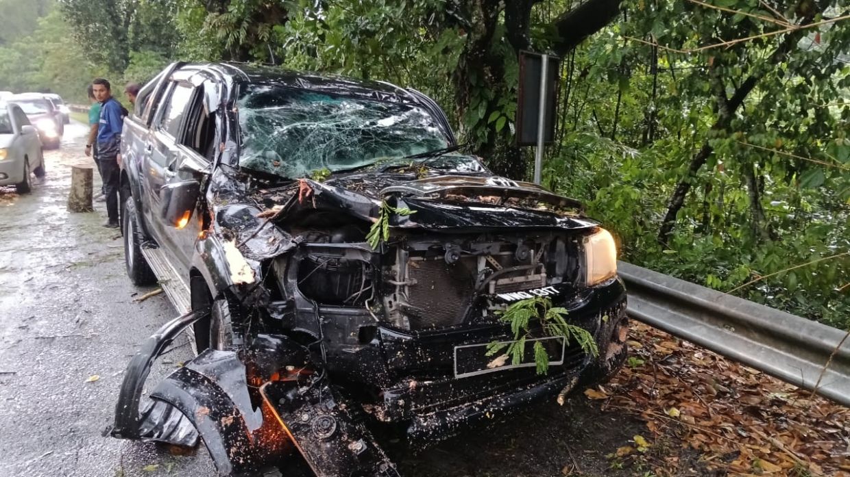 PETALING JAYA: A driver escaped shaken but unscathed when a falling tree crushed his pickup truck on Jalan Selayang-Kepong towards the Forest Research Institute Malaysia (FRIM) on Monday (April 20).