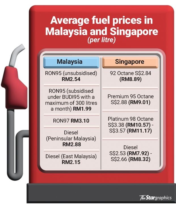 A quick check revealed a vast difference in petrol prices between Malaysia and the island republic, with Malaysia’s RON97 priced at RM3.10 per litre, while Singapore’s lowest-grade petrol, 92-octane, is priced at S$2.84 (RM8.89) per litre (see graphic).