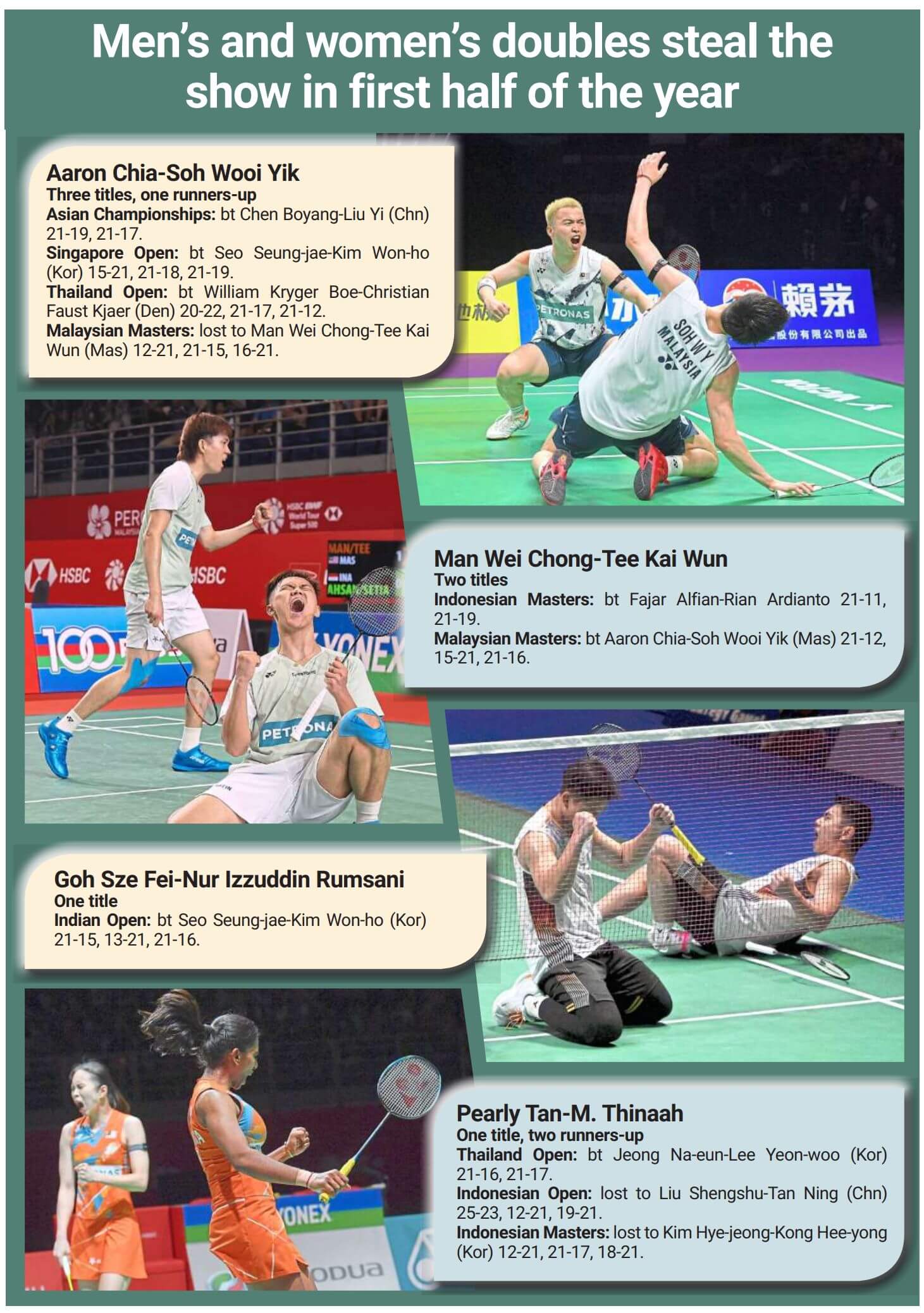 Pearly-Thinaah won the Thailand Open and finished runners-up in both the Indonesian Open and Masters.