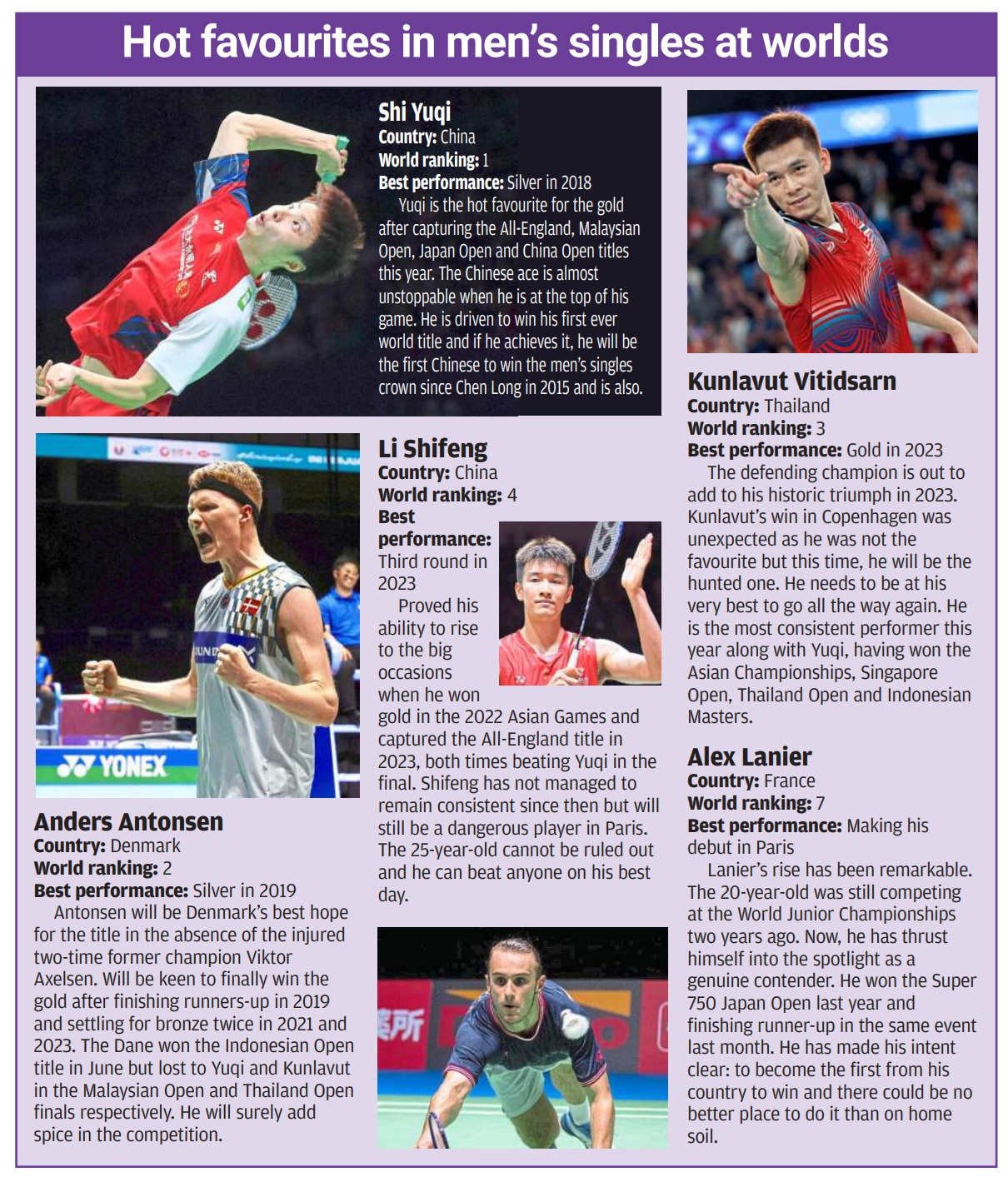 The others who could challenge for the title are Yuqi’s teammate world No. 4 Li Shifeng, world No. 7 Frenchman Alex Lanier and Indonesia’s Jonatan Christie (No. 5).
