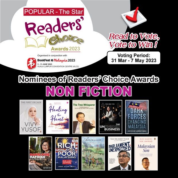 Readers are invited to vote for their favourite Fiction and Non-Fiction titles on Popular website www.popular.com.my or BookFest @ Malaysia website https://www.bookfestmalaysia.com/ and Popular Malaysia Facebook from March 31 – May 7.