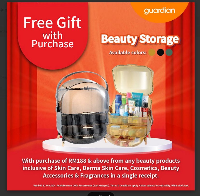 Additionally, receive a free beauty storage when you spend RM188 or more on any beauty products, including skin care, derma skin care, cosmetics, beauty accessories, and fragrances in a single receipt.
